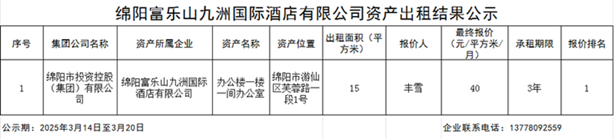 綿陽富樂山九洲國際酒店有限公司資產出租結果公示