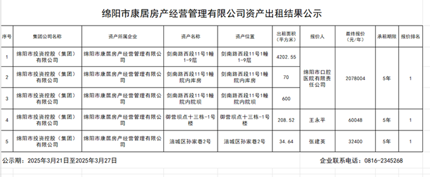 綿陽市康居房產經營管理有限公司資產出租結果公示