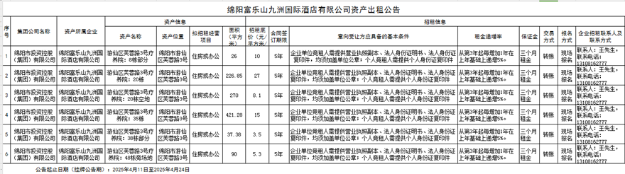 綿陽富樂山九洲國際酒店有限公司資產出租公告