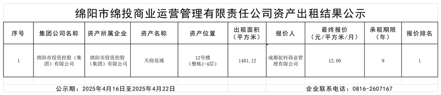 綿陽市綿投商業運營管理有限責任公司資產出租結果公示