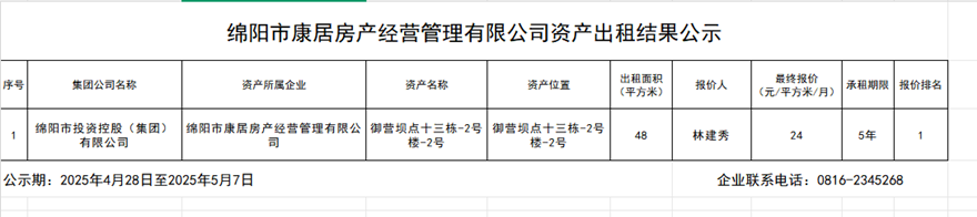 綿陽市康居房產經營管理有限公司資產出租結果公示