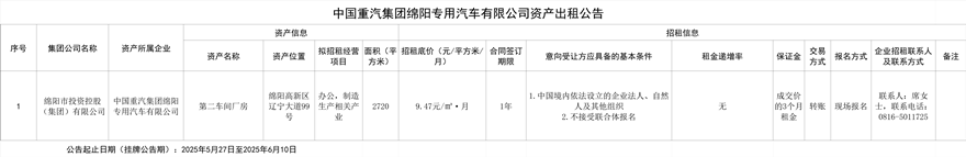 中國重汽集團綿陽專用汽車有限公司資產出租公告