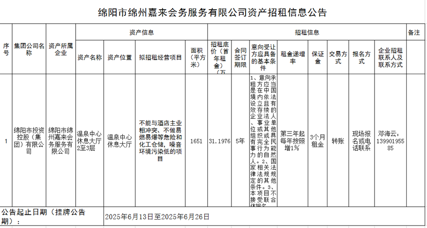 綿陽市綿州嘉來會務(wù)服務(wù)有限公司資產(chǎn)招租信息公告