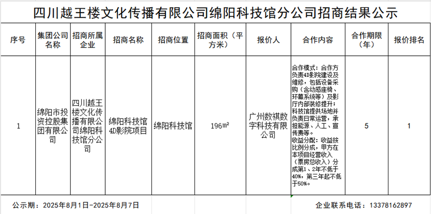 四川越王樓文化傳播有限公司綿陽科技城分公司招商結果公示