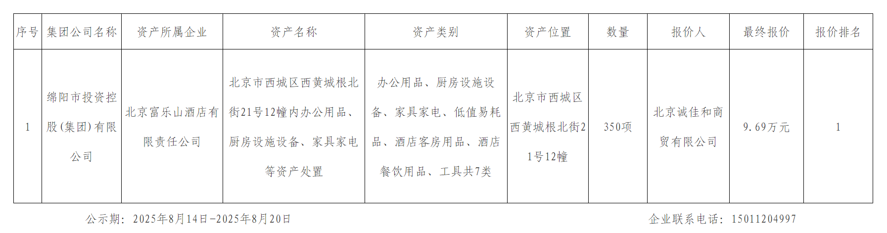 北京富樂(lè)山酒店有限責(zé)任公司資產(chǎn)處置結(jié)果公示
