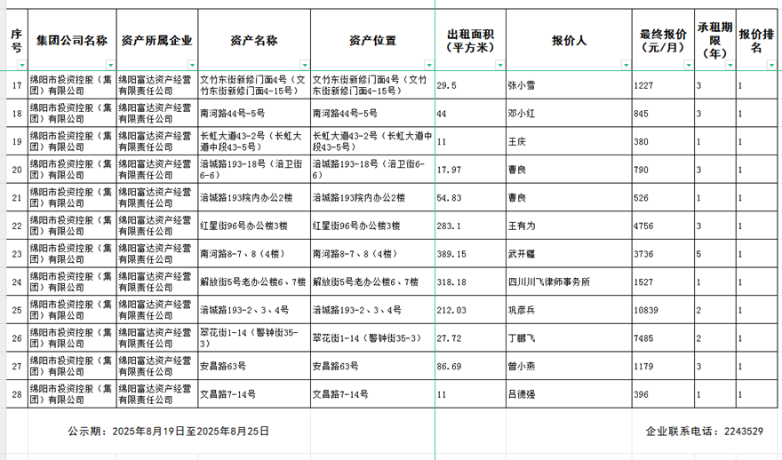 綿陽富達資產經營有限責任公司出租結果公示