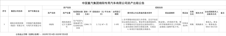 中國重汽集團綿陽專用汽車有限公司資產出租公告