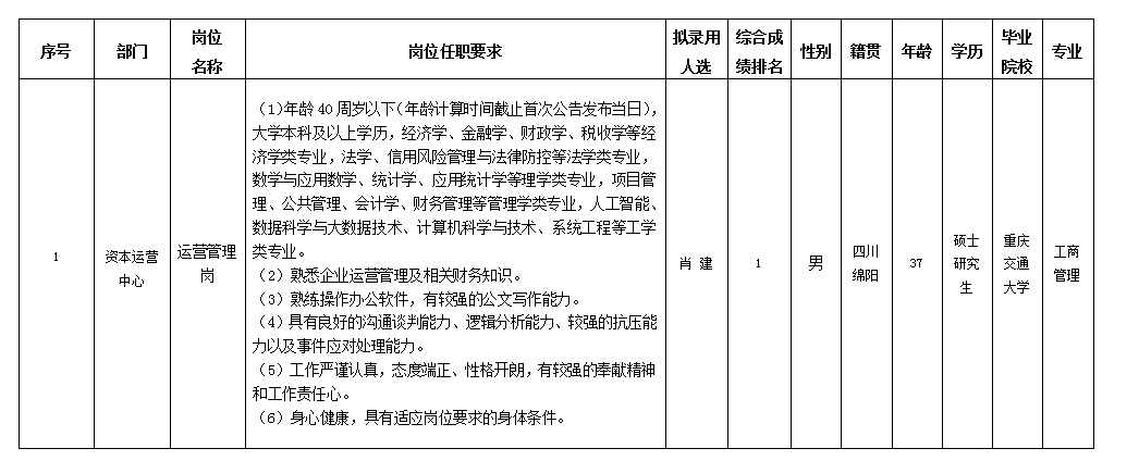 根據綿陽市投資控股(集團)有限公司發布的招聘公告及招聘相關規定,經筆試、面試、考察、體檢等程序,擬錄用肖建同志到綿陽市投資控股(集團)有限公司工作,現予以公示,具體情況如下: