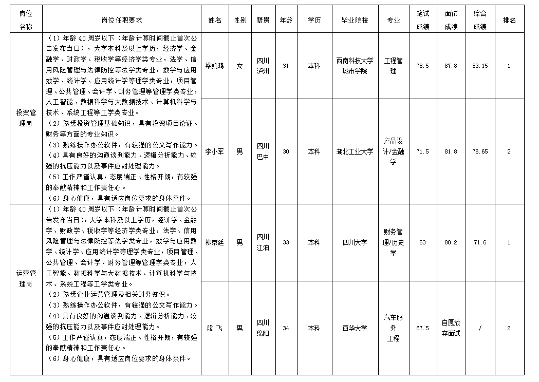 根據綿陽市投資控股(集團)有限公司發布的招聘公告及招聘相關規定,經筆試、面試等程序,現將筆試(面試)成績予以公示。