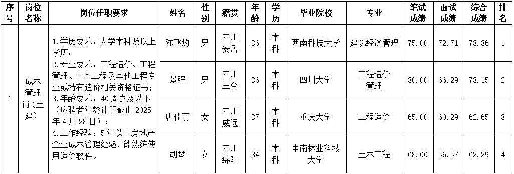 根據綿陽市綿投置地有限公司發布的招聘公告及招聘相關規定,經筆試、面試等程序,現將筆試、面試成績予以公示。