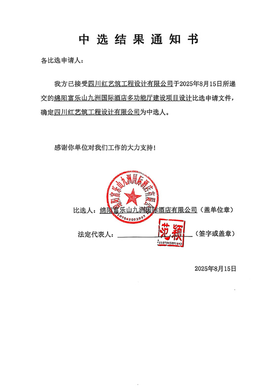 綿陽富樂山九洲國際酒店多功能廳建設(shè)項目設(shè)計中選結(jié)果通知