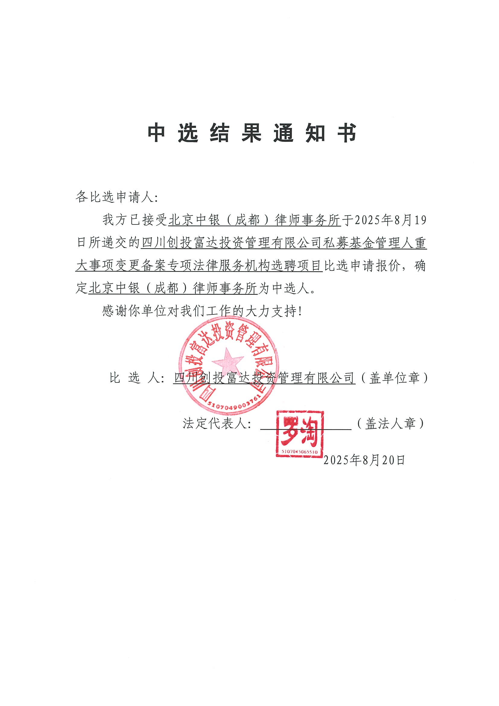 創投富達私募基金管理人重大事項變更備案專項法律服務機構選聘中選結果通知